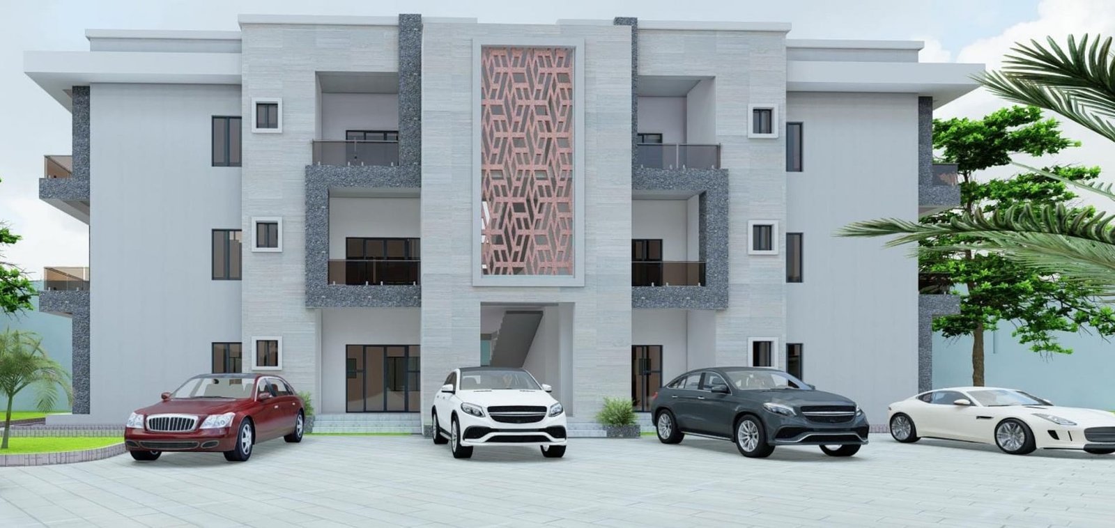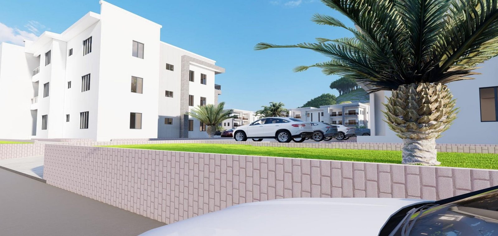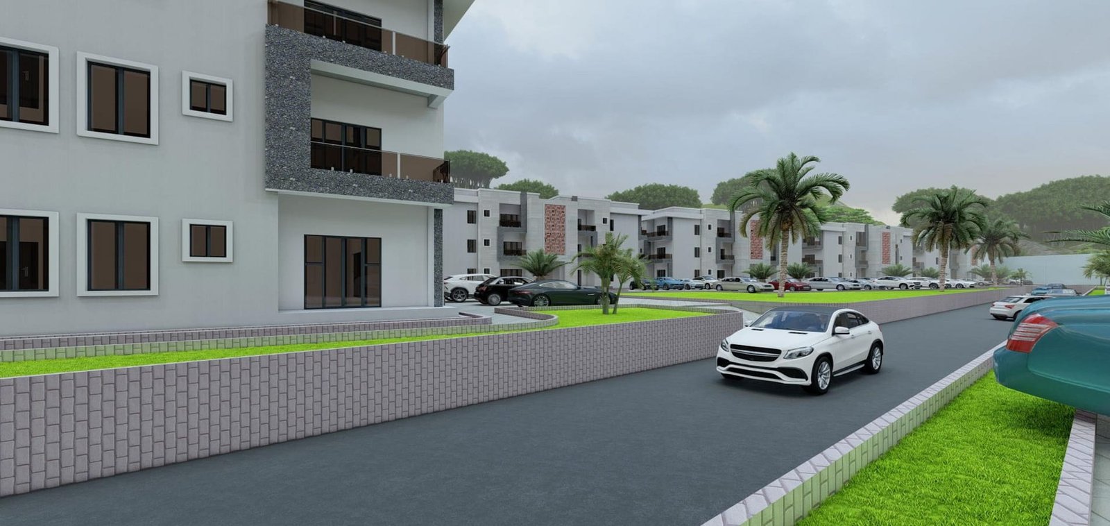 Design of a residential estate comprising multiple blocks of 2-bedroom and 3-bedroom apartments with integrated infrastructure, road networks, and landscaped communal areas.
